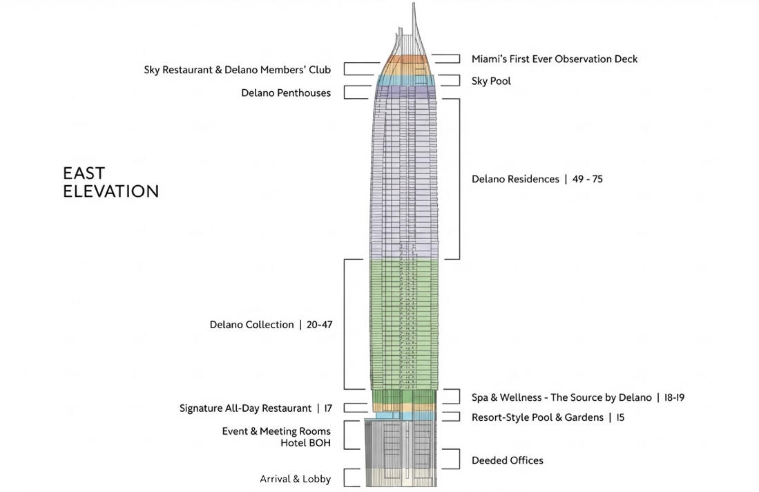 Delano ofrece una cuidada colección de amenidades inmersivas diseñadas para la relajación, el bienestar y el entretenimiento. Los residentes pueden disfrutar de dos piscinas estilo resort, incluida una sky pool ubicada a 800 pies sobre el skyline de Miami, así como de un spa y centro de bienestar de un piso completo con sauna, vapor, piscina de inmersión fría y salas de tratamiento.El proyecto también cuenta con un gimnasio de última generación con estudios de movimiento, una propuesta gastronómica de clase mundial con dos restaurantes emblemáticos, un icónico restaurante en las alturas, el Legendary Rose Bar y exclusivos salones sociales cuidadosamente curados.Entre las amenidades adicionales se incluyen un lobby premium con porte-cochère, espacios dedicados para reuniones y eventos, y acceso exclusivo al D Members’ Club, ofreciendo un estilo de vida que combina lujo, cultura y conveniencia.